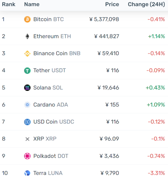 時価総額トップ10では、イーサリアム(ETH)が約1%の上昇となっていますね。