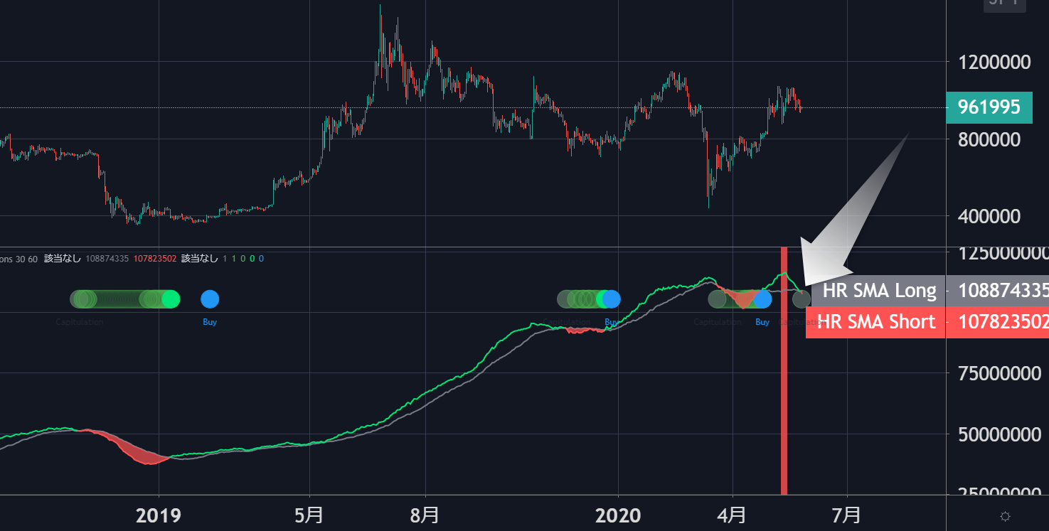 デッドクロスは2018年後半から主に4度あり、2018年11月の65万円→35万円の直前にもハッシュリボンがデッドクロスし、下落を的中させました。